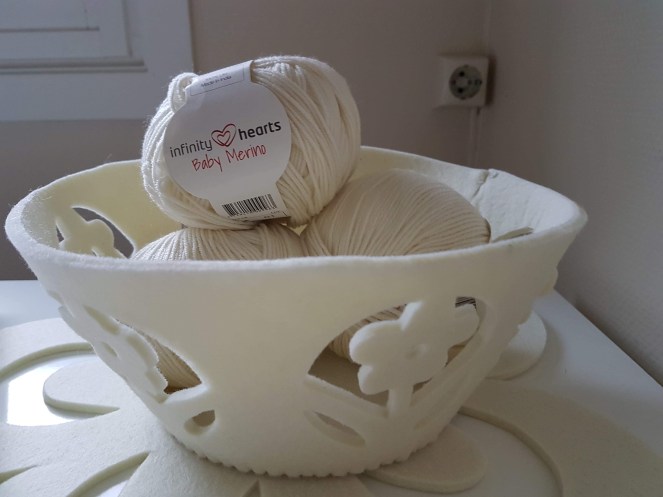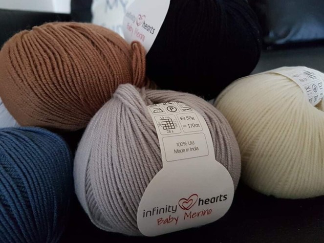 Garnet Infinity Hearts Baby Merino er mykt og smidig, enkelt å jobbe med og av god kvalitet. Det er relativt tynt, passer til pinnetykkelse ca. 2,5 og 3 og skal være slik at det ikke klør på sart babyhud. Det kommer i mange fargenyanser, du trenger ikke bare strikke hvitt, lyserosa og babyblå. Jeg kommer til å lage sokker og siklesmekker av garnet, og luer til voksne.