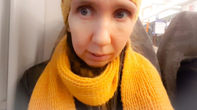 Dessuten, psykisk sykdom trenger ikke synes på utsiden om jeg bare kler meg godt. Altså, dekker til knokler og arr. Jeg har på meg den nyeste, fineste cardiganen min. En liten touch sminke. Jeg føler meg fin mens toget flyr. Skulle tro det var flytoget. Eller så er det svevende hus langs etter skinnegangene, med lysstriper som slynger seg mellom nedstengte stasjoner. Verden er ikke lenger det den en gang var. Den har blitt digital og min største angst før togturen var å skulle administrere ruter-appen i stedet for en vennlig billettselger på stasjonen. Tenke seg til! Jeg var på tur. Ano 2019.