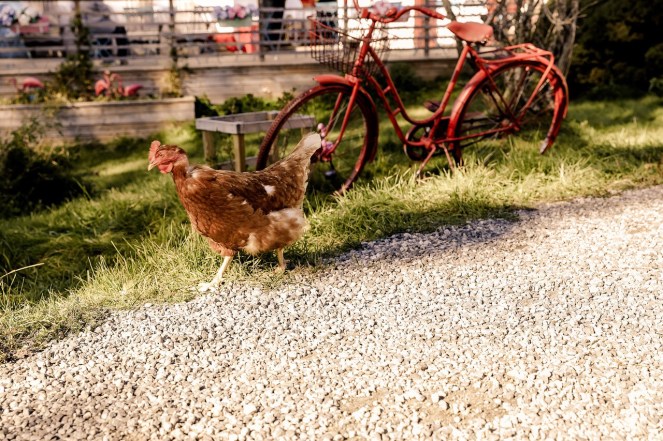 Det var høner overalt. Og de la egg overalt. Vi så et egg inne hos geitene. Denne malplasseringen fikk meg til å smile. Dyrene lever! I harmoni om symbiose.Til og med hundene gikk side om side med frittgående høns. Som gjest, kan man være med å samle inn eggene. Jeg møtte to små jenter der den ene fortalte meg om egget hun fant, mens hun strålte stolt.