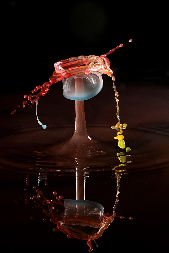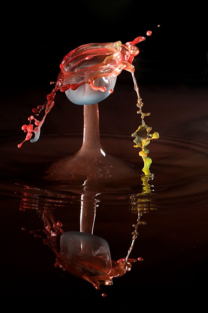 Da jeg tok dråpebilder på søndag, fikk jeg to figurer som minnet meg om ei jente med fletter. Den ene dåpen er «glad», den andre «trist» (og litt sjenert). Jeg bruker gåsetegn fordi dråper egentlig ikke har følelser. Men man vet jo aldri, når de danser foran kameraet mitt. (Innlegget fortsetter under bildet.)