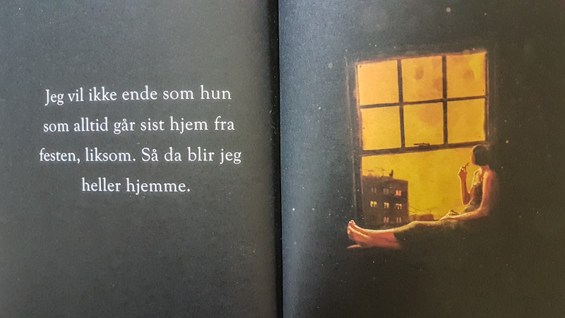 Og hvilken fulltreffer! Jeg likte spesielt en tekst der jeg-personen vekslet mellom å lytte til ungdommen sin og alderdommen. Alderdommen som fikk henne til å droppe festlivet, ta «kjedelige» valg og våkne edru. Være redd og «fornuftig», og derpå forsiktig og ikke ta de samme sjansene som før, det ungdommen ville finne på. Hæla i taket.