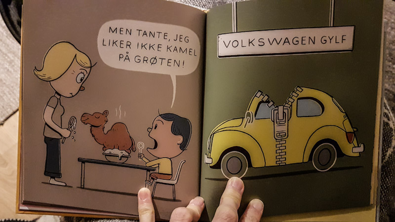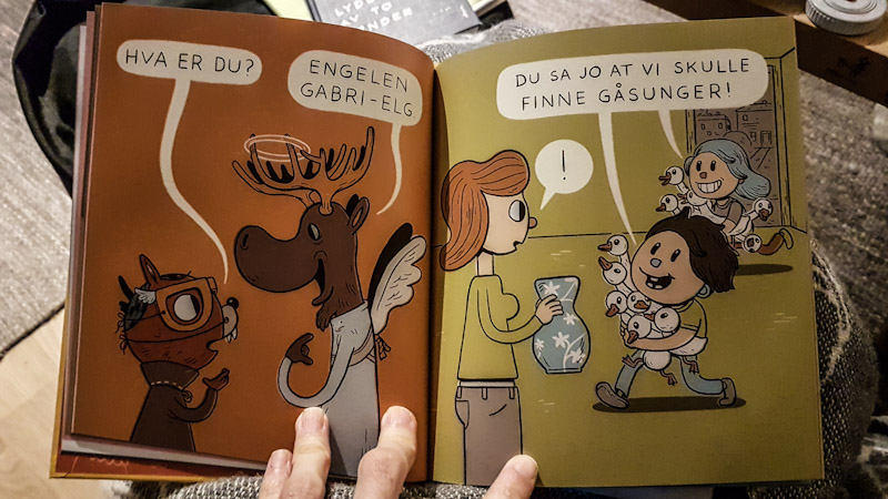 Det spilles på bokstavlig tolkning, og komikken det kan skape, på mange av sidene. Jeg synes slikt er veldig gøy, og er spent på hvordan boka blir mottatt av den yngre garde. Vil de forstå ordspillene? Sammen med illustrerende bilder tror jeg at skaperne har truffet spikeren på hodet.