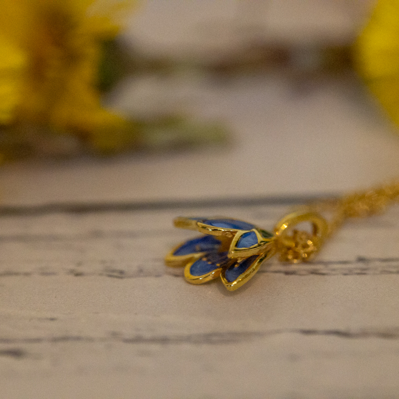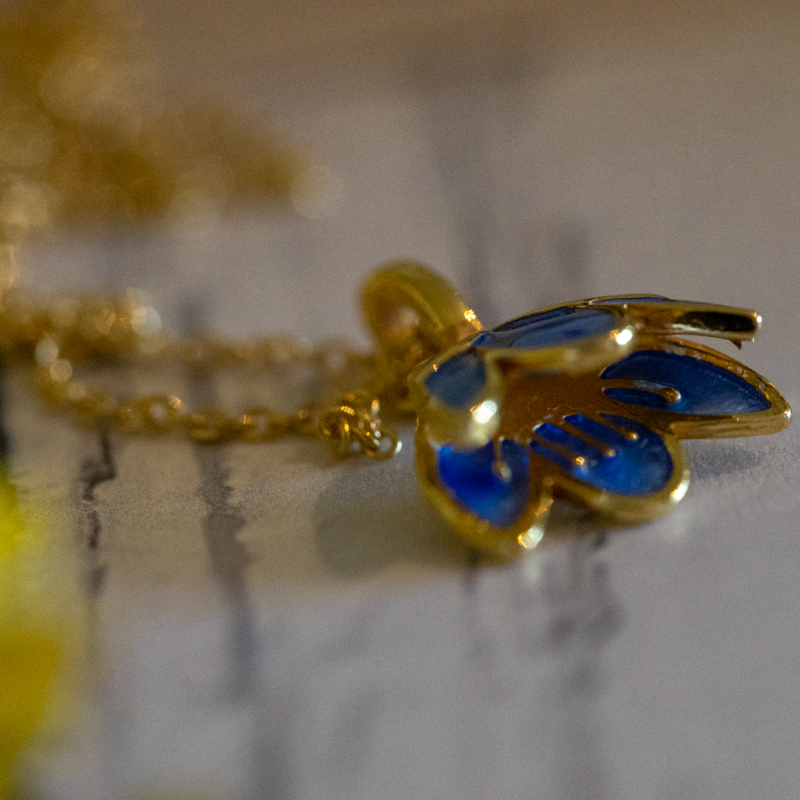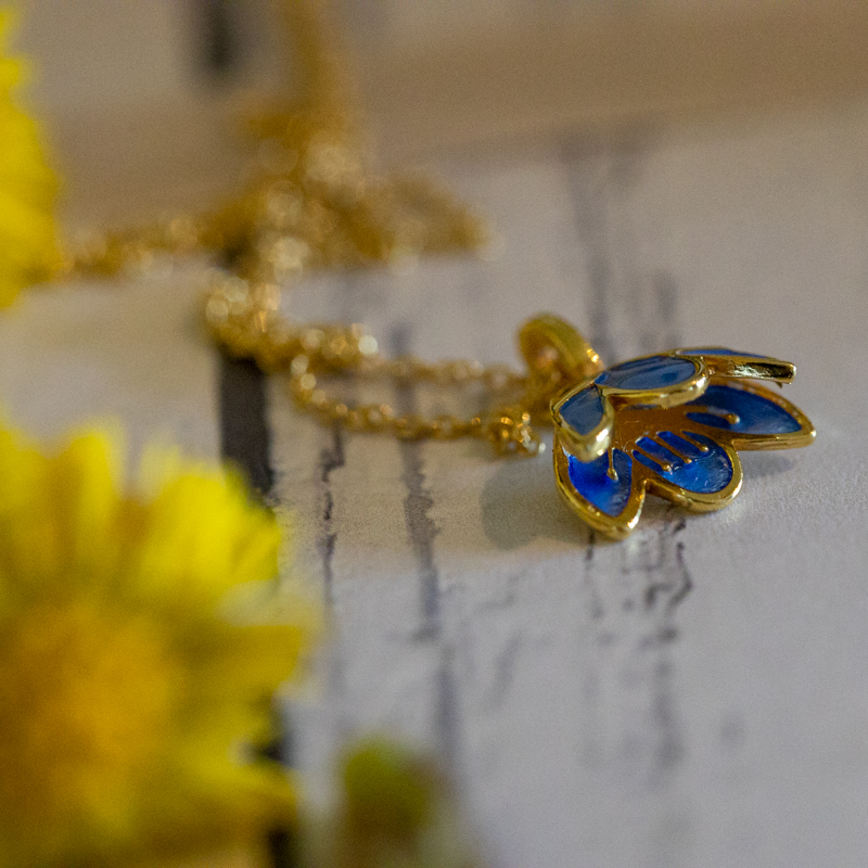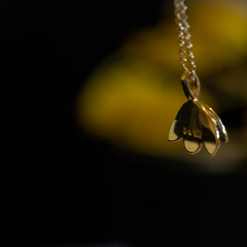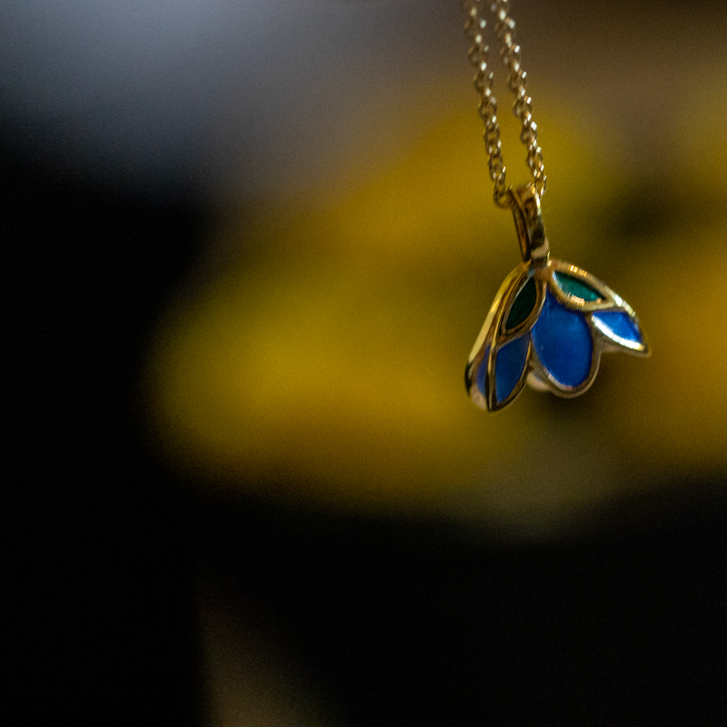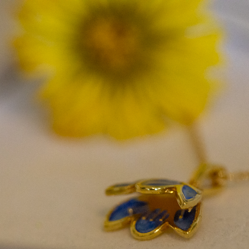 Jeg bærer blåveis-anhenget som måler 12 x 14 mm og henger i et kjede på 45 centimeter, rundt halsen. Det er forgylt, så baksiden er farget av gull. Smykket er et håndlaget, og jeg kjenner meg som en levende kunstutstilling. (Innlegget fortsetter under bildet.)