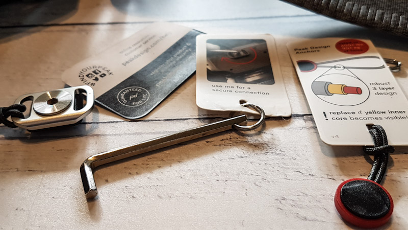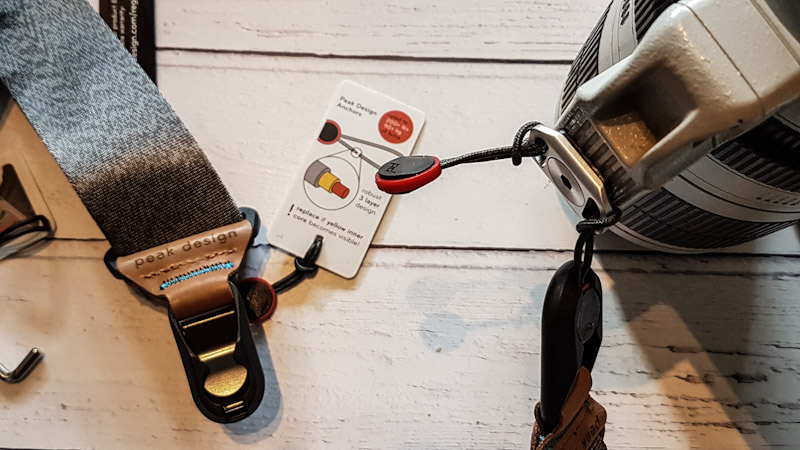 Et eget feste som følger med, monterte jeg på objektivet med medfølgende umbrako. Festet kan også skrus på kameraet, hvis det er på kameraet man vil bruke remmen. Remmen kan klipses lett av og på. Jeg fikk en skikkelig positiv opplevelse av remmen, både inntrykket av finish og detaljer og konstruksjon, sammen med den store aha-opplevelsen da jeg fikk festet remmen og avlastet vekten av objektivet fra skuldrene mine og kameraet. (Innlegget fortsetter under bildet.)