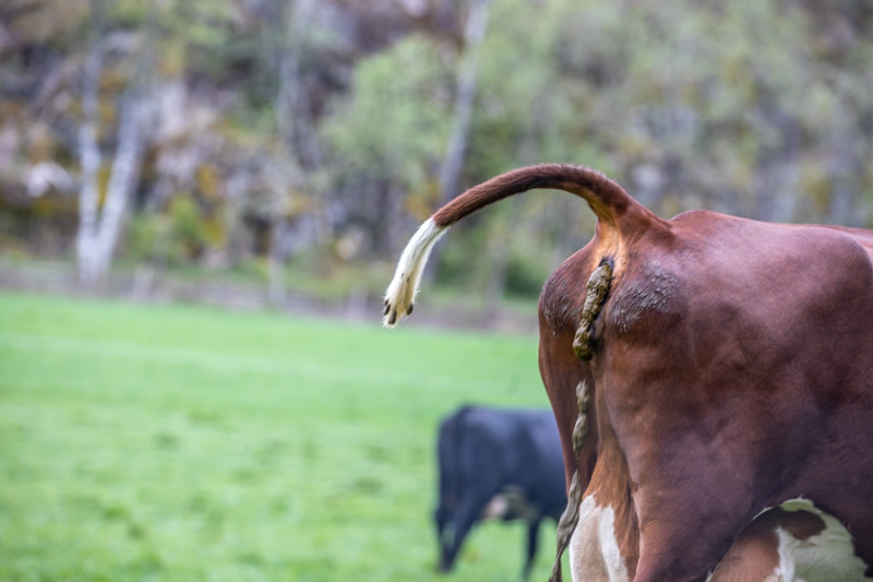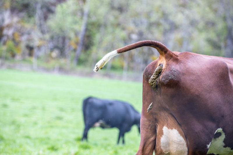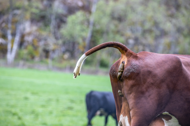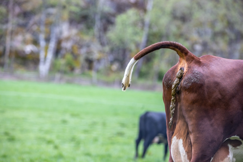 Man kan kanskje løfte på halen og logre litt, som en hund, og la dritten regne. Jeg hørte den falle til bakken da jeg fotograferte disse melkekyrene. Det fikk meg til å tenke på alt jeg har hørt om klimagasser og utslipp. (Innlegget fortsetter under bildet.)