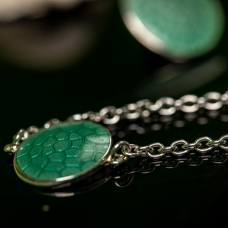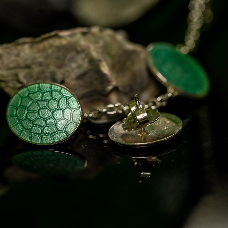 Naturserien har en kolleksjon med blader, en med sjøstjerner og skjell (sånne du finner på stranden) og denne skallet (turtle shell). Turtle-øredobbene, måler 1,1 cm i bredden og 2,8 i høyden, som gjør at de gjør mye ut av seg selv om de ikke henger ned fra øret. De sitter godt på, og det verdsetter jeg så veldig. Som på mange av de andre smykkene, kan man bestille Custom Color fra et fargekart som er enormt fargerikt – for å si det med et smil om munnen, noe jeg ofte har når jeg skriver om gleden jeg føler med emaljesmykkene. Fargene gjør de mer uttrykksfulle for meg enn «bare» sølv eller gull. Farger har jo en symbolverdi, i tillegg til at vi ofte har våre personlige favoritter. Og mens jeg leker litt med fargeskrinet og ordene, kan jeg legge til at de er «skjell-dent» vakre! Jeg beveger meg ut.