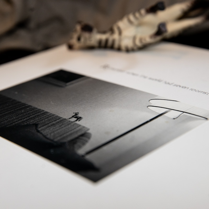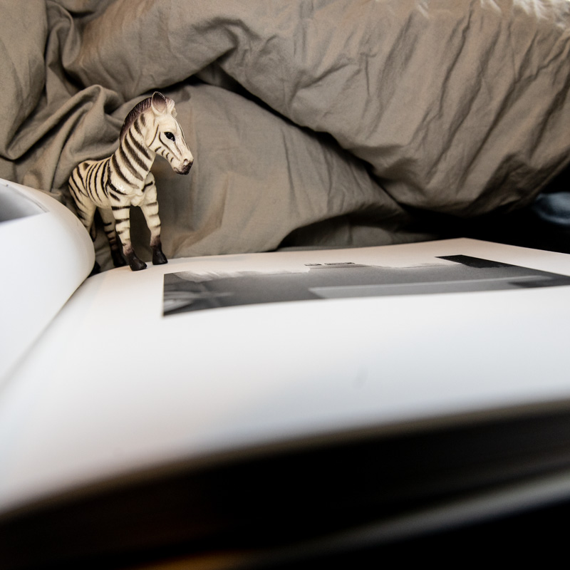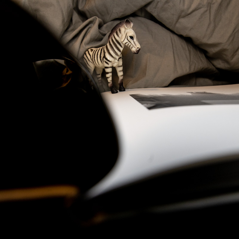 Uttrykkene er verken banale eller klisjefylte. De er originale. De er annerledes. De er likevel tatt ut fra et normalt hjem. Et slikt jeg kan skape meg her hjemme også, om jeg bare rydder meg litt plass, fjerner noen elementer som ville være i veien for «språket». Lekefigurer, lys, små sånne glimt som tilsammen utgjør en forskjell i fotografiet. Detaljer og atmosfære, stemmer i mørket. Det blir natt og det blir dag. Jeg løfter meg opp av sengen og ser i ut i rommet, fester øynene vekselsvis på en liten sebra på sengegavlen og foldene i lakenet. Brett meg ut.