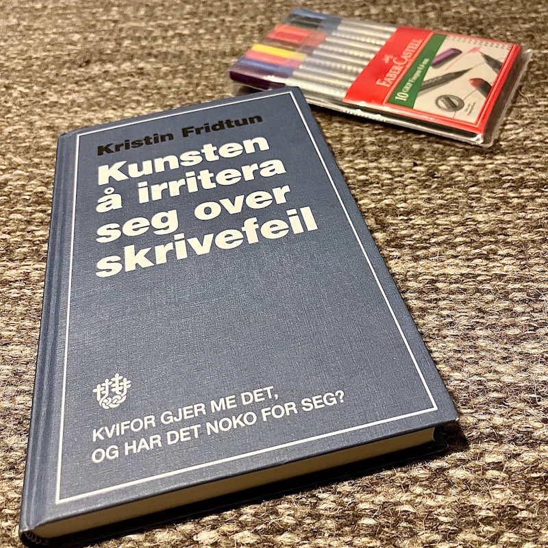 Eg har no lese ho, ei sakprosa-bok av forfattar Kristin Fridtun, som verkeleg greip tak i meg og skjerpa fokuset, fekk meg nyfiken og faktisk grunnleggjande munter. Ho heiter Kunsten å irritera seg over skrivefeil (Det Norske Samlaget 2021) og eg gler meg til å fortelje litt om ho no.