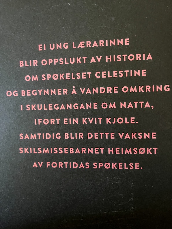 Celestine er løyndomsfull roman, vil eg seie (eller skrive), fortetta i innhald og form, store kjensler og to slags historier, pakka ned i eitt lite format. Boka tek for seg ei ung lærarinne som flytter til bygda for å undervise på ein internatskule. Tidlegare var kostskulen eit slott, og det rullerar ei historie om spøkelset Celestine som skal ha vorte mura inne i veggane då ho var ungdom. Lærarinna blir besett av historia og byrjar vandre rundt som Celestine sjølv nattestid, i korridorane på skulen, iført ein lang kvit kjole med volangar.