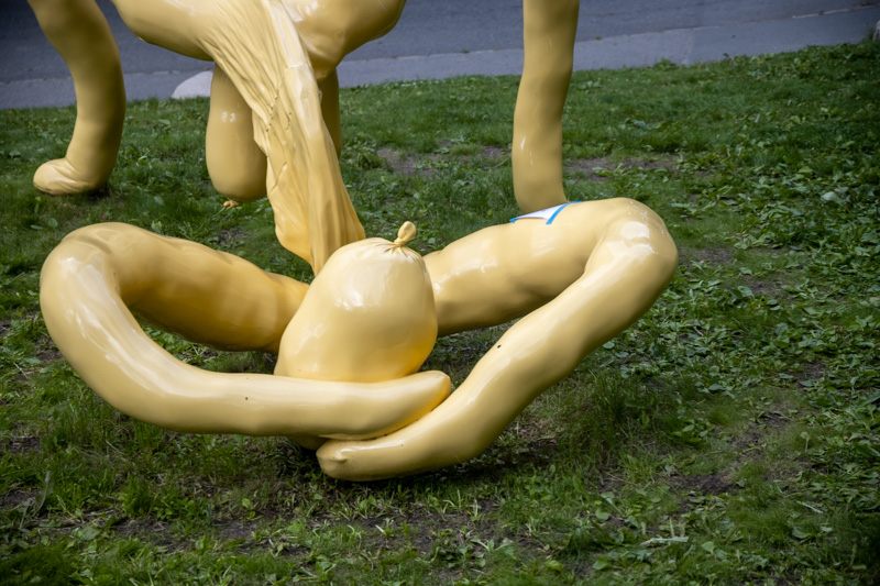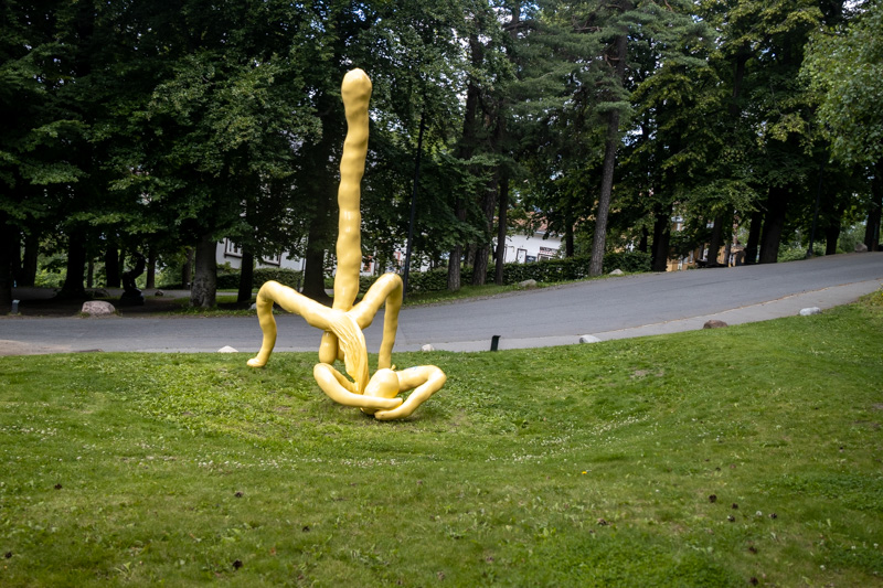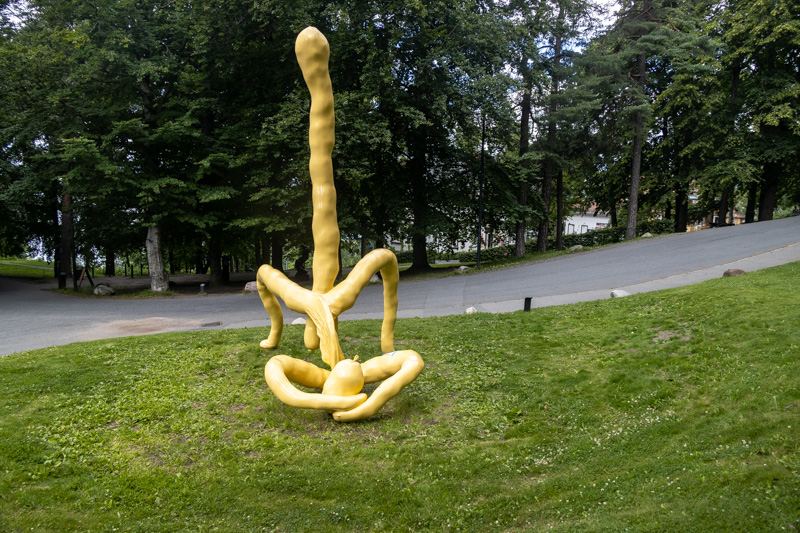 Denne skulpturen, stikker seg ut i Ekebergparken, der jeg var på lørdag (9. juli 2022). Den er gul, den er lysende, den er stor, den eksploderer nesten med en erigert penis. Den er absurd, den er grov, den er morsom. Akkurat passe til at man smiler i stedet for å bli støtt. Innlegget fortsetter under bildet.