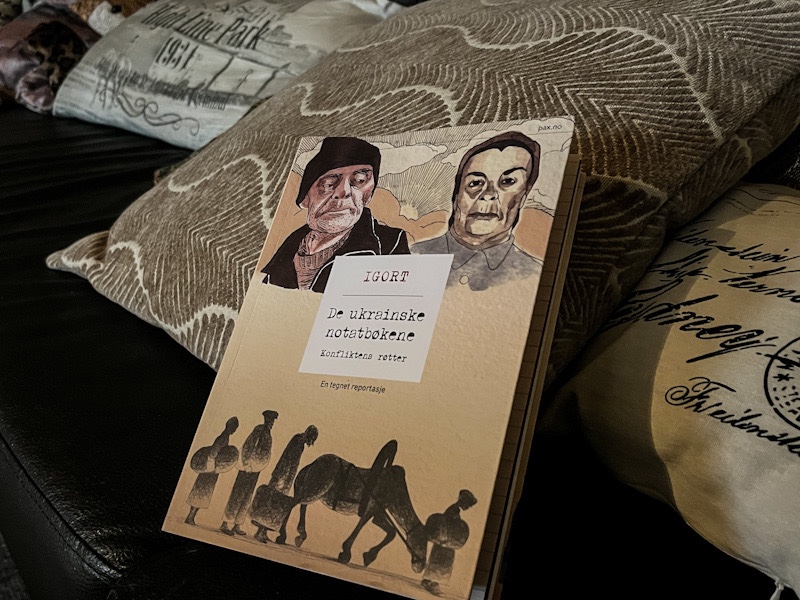 Den italienske tegneserieskaperen Igort er aktuell med boka De ukrainske notatbøkene. Konfliktens røtter, som er en tegnet reportasje. På norsk er den utgitt av Pax Forlag (2022, lesereksemplar fra forlaget). Jeg som til vanlig ikke snakker så mye om nyheter og storpolitikk, jeg føler jeg blir for liten og maktesløs og ikke vet hva de andre snakker om – begynte å snakke som en foss mens jeg leste. Dette er en bok som viser hvordan noen i Ukraina har levd. Under hva slags forhold. Jeg fikk se det i tekst og bilder. Svart på hvitt og i noen fargenyanser. Jeg ble virkelig overrasket og fra å bare føle jeg kom til kort, strakk jeg meg mot leselys.