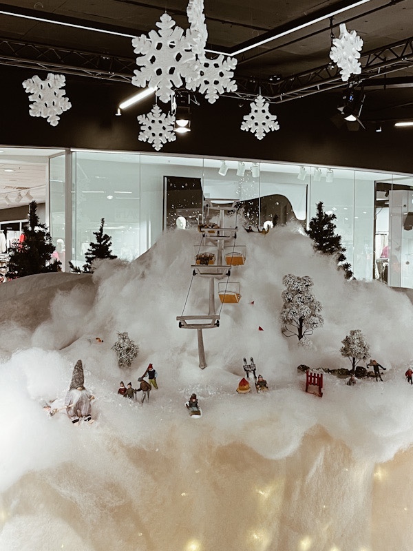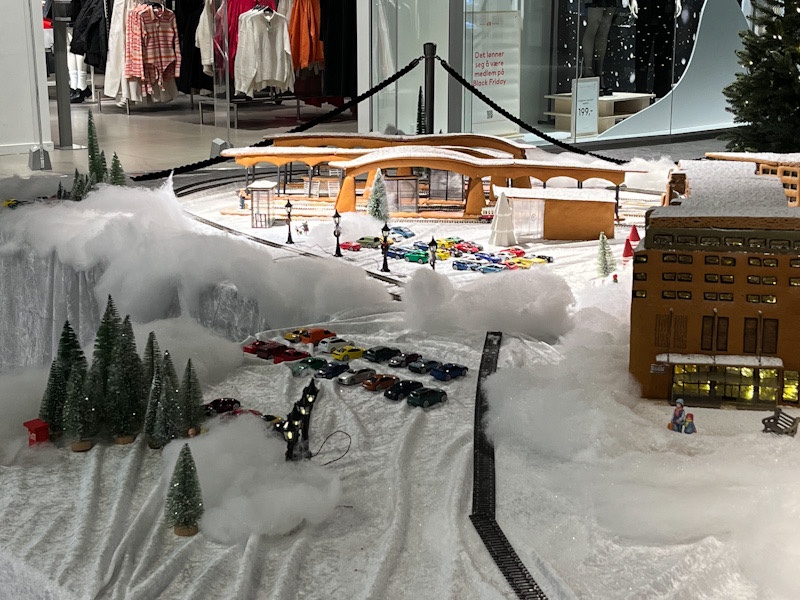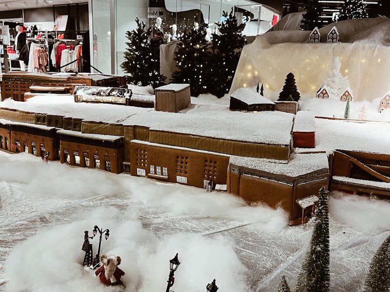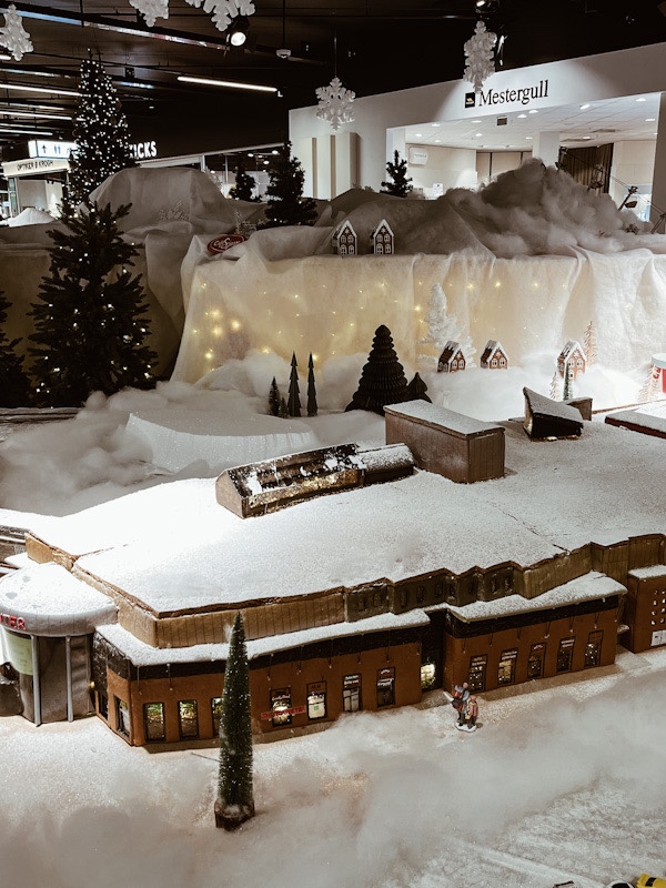 Pepperkakebyen i Bergen er jo en stor tradisjon. Der har jeg dessverre ikke vært, men jeg vil tipse om å ha øynene oppe der man bor. For her for eksempel, like ved meg, på Ski Storsenter, har det kommet en aldri så liten pepperkakeby. Den viser togstasjonen, så ny og flott. Den viser kjøpesenteret. Den har også fått en skiheis, som om snøen virkelig var her! Fotografiene i innlegget er derfra, jeg tok dem med mobilen min 23. november i år. Innlegget fortsetter under bildet.
