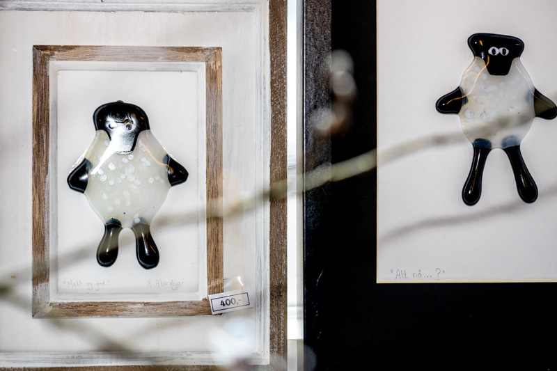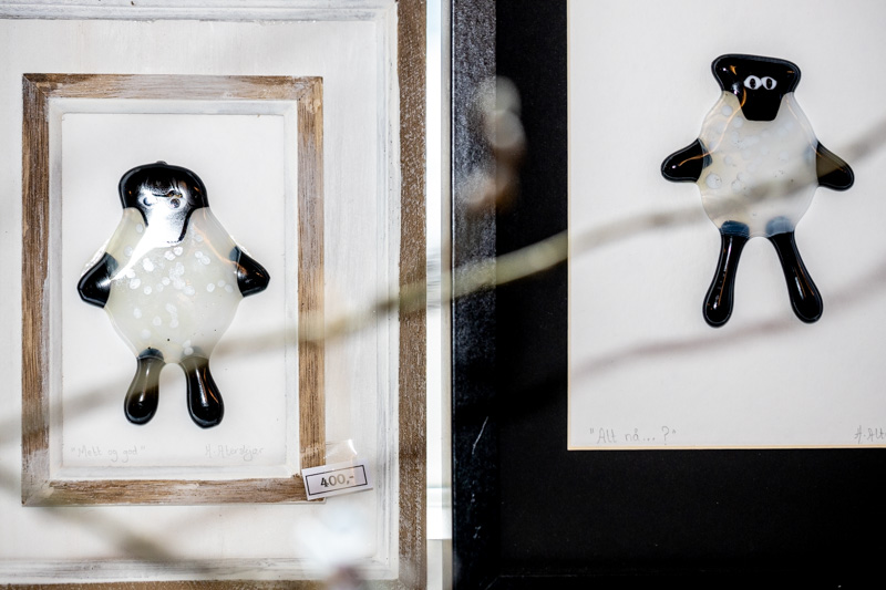 Bilder: Glasskunst av Helene Alterskjær, jeg fotograferte disse tøffe sauene i ramme da jeg så disse på Julemarked – Folkets hus Ski, 19. nov 2022.