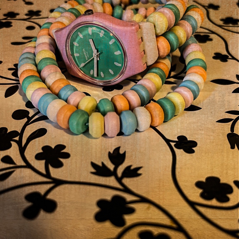Da jeg var liten, hadde jeg noen veldig fine klokker fra Swatch, pappa kjøpte til meg på reise. De var fargerike og litt magiske, syns jeg. Like før jul 2022, bestemte jeg meg for å kjøpe meg en ny Swatch, med litt nostalgisk og morsomt utseende. Jeg hadde lyst til å ha en analog klokke med gode minner i i tillegg til apple-watchen. Jeg valgte meg en Swatch som ligner på sånne sukkertøy-armbånd som var vanlige på 80-90 tallet. Klokka mi er kul, søt og morsom.