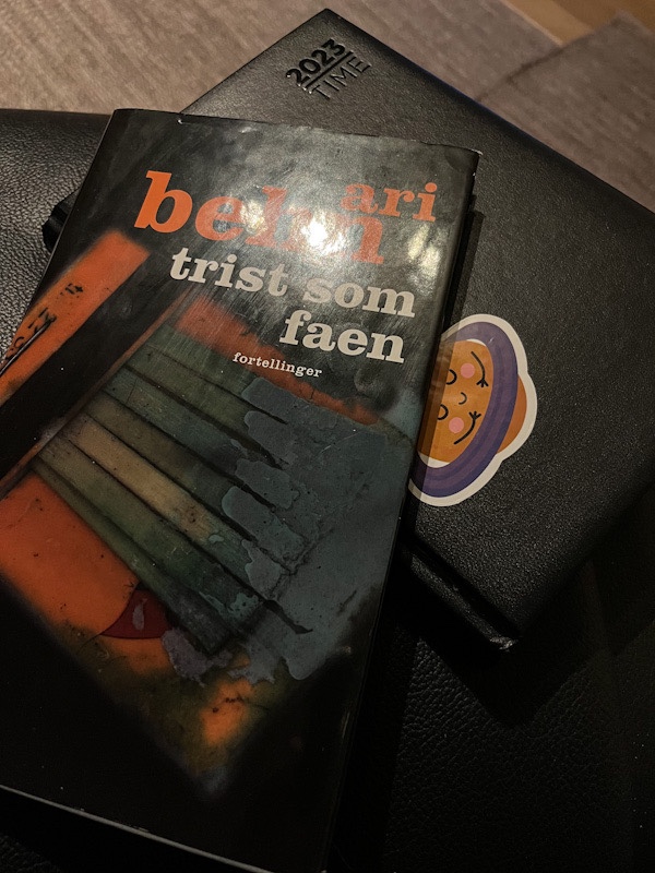 Jeg har lest Trist som faen – fortellinger av Ari Behn (Kolon forlag 1999, min utgave Boklubben dagens bøker 2001). Denne vesle boka med korte historier, satt sammen til noe som fikk anmeldere til å ta imot Ari Behn til og med med en sekser som ble tatovert til evig inn.