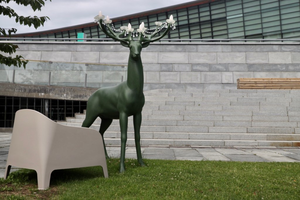 Rundt meg nå: Sauebjeller. Grønt gress på taket.