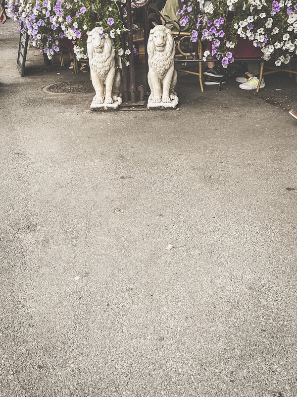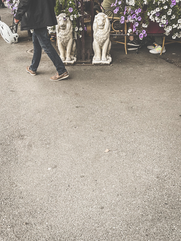 Tilbake til virkeligheten. Jeg smyger meg mellom løvene. Kan de spise meg, ete meg opp? Eller er jeg igjen fantasi. Kan jeg finne opp, en mer bærekraftig vei, vandre en drøm som holder meg på jorda? Jeg går på, er jeg vandringsmann eller kvinne, den ganske nordmann, får jeg i gatene der høre til. Jeg skal til Oslo i morgen ettermiddag, vil jeg der gå i trygge, gode fotspor. Kan løven sluke de vonde følelsene, angsten jeg noen ganger kjenner når jeg opplever kroppen min stor og/eller diffus?