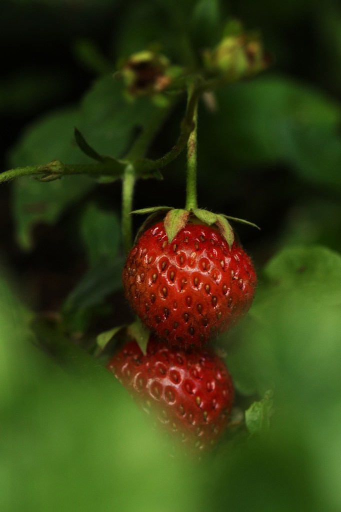 Markjordbær høyt på strå, drysset ned med sukker på - Sett i en sommer-refleksjon: