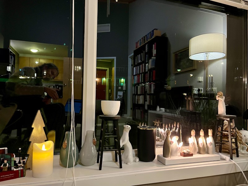 Mens jeg satt slik og reflekterte i de strålende lysene – både de faktiske og refleksjonene i vinduet, så jeg alt som er vakkert. Jeg tenkte: Finnes Gud? Lyset finnes, det er i alle fall sikkert. Og jeg tenker, at vi alle kan skinne litt for hverandre og selv være flinke til å la oss skinne litt.