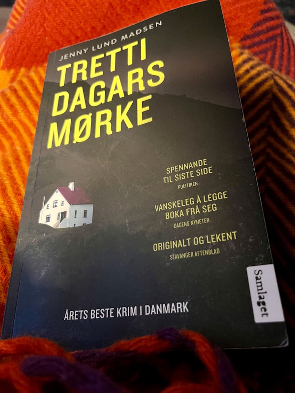 Eg har lese Tretti dagars mørke av Jenny Lund Madsen (Samlaget 2024). Boka vart årets beste krim i Danmark og sjølv eg som sjeldan les krim, vart særs fenga av storyen. Kanskje vart eg hjelpt av at hovudpersonen var forfattar som prøvde å setje ein bestseljande rival på plass? Ramma for forteljinga vart med det menneskeleg, engasjerande og for meg meir handgripeleg.