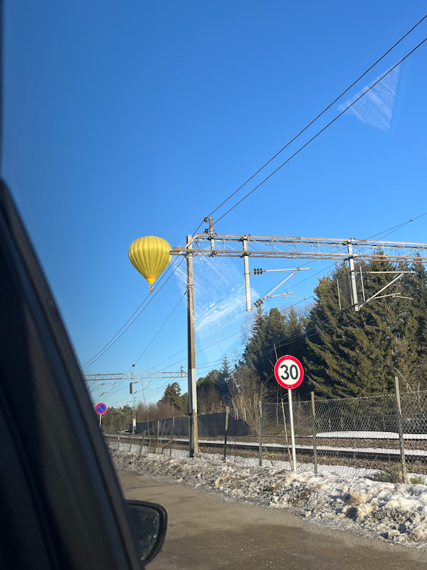 Når man fotograferer, er noe av kunsten å fange øyeblikket. Da jeg var på tur på lørdag, så vi to luftballonger. Da jeg tok bildet med telefonen min av den ene, fikk jeg med trafikkskiltet som skulle sørge for at vi ikke kjørte for fort i et område der folk ofte krysser veien. Det ble til et fortellende bildet der man kunne tenke seg at luftballongen måtte passe på farta si.