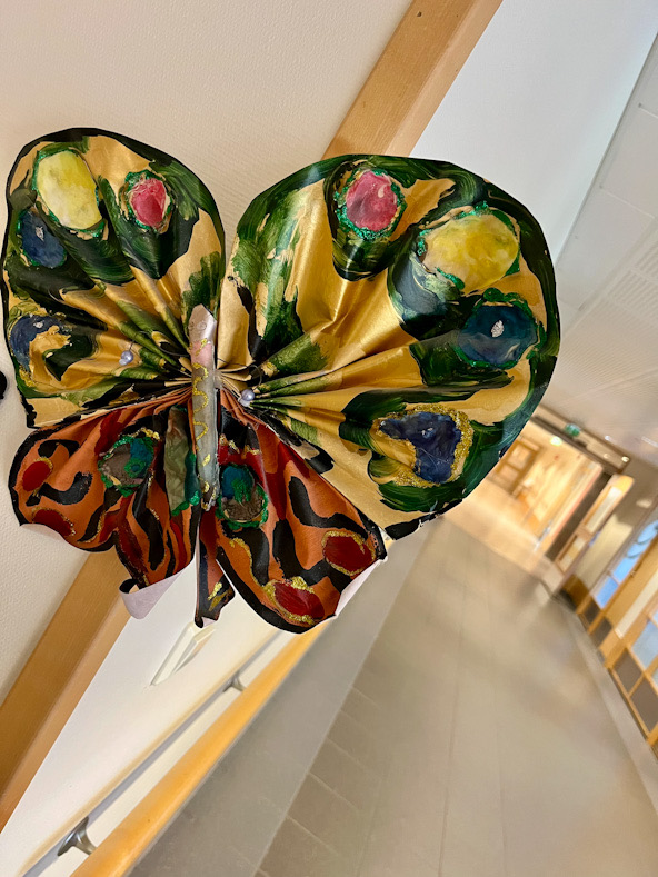En sommerfugl i korridoren, så vakker at jeg fotograferte den både fysisk med mobilen og la den på netthinnen min! Og jeg aner: noen med et godt hjerte har plantet den der, med tanke på menneskene som til vanlig ferdes der inne. Englevakt i sommerfulgdrakt?