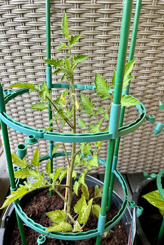 Hvis jeg har en altfor smertefull dag, kan jeg sette meg ned, bla i bøker, skravle med mennesker jeg er trygg på og uansett kjenne – det har mening og verdi det også! Det har verdi fordi jeg er umenneskelig glad, med andre ord. Jeg er glad for menneskene rundt meg, takknemlig og tilfreds når jeg hører til. Jeg er glad for grønnsaker og planter som vokser opp fra jorda og strekker seg mot himmelen. Jeg ser opp på blå himmel stadig vekk. Jeg liker å kjenne sola røre meg over håret og vinden stryke meg på kinnene. Til og med regnet kan gjøre godt, da er jeg i nærkontakt med naturen og jeg kan se: gresset spire ytterligere med. Illustrasjonsfotoet under: tomatplanten som strekker seg, slik jeg strekker meg for mest mulig gode hverdager. Hver dag! Bildet er tatt i går og dokumenterer at planten nå har fått sine to første blomster – som bærer løfter om søte cherrytomater før høsten setter inn.