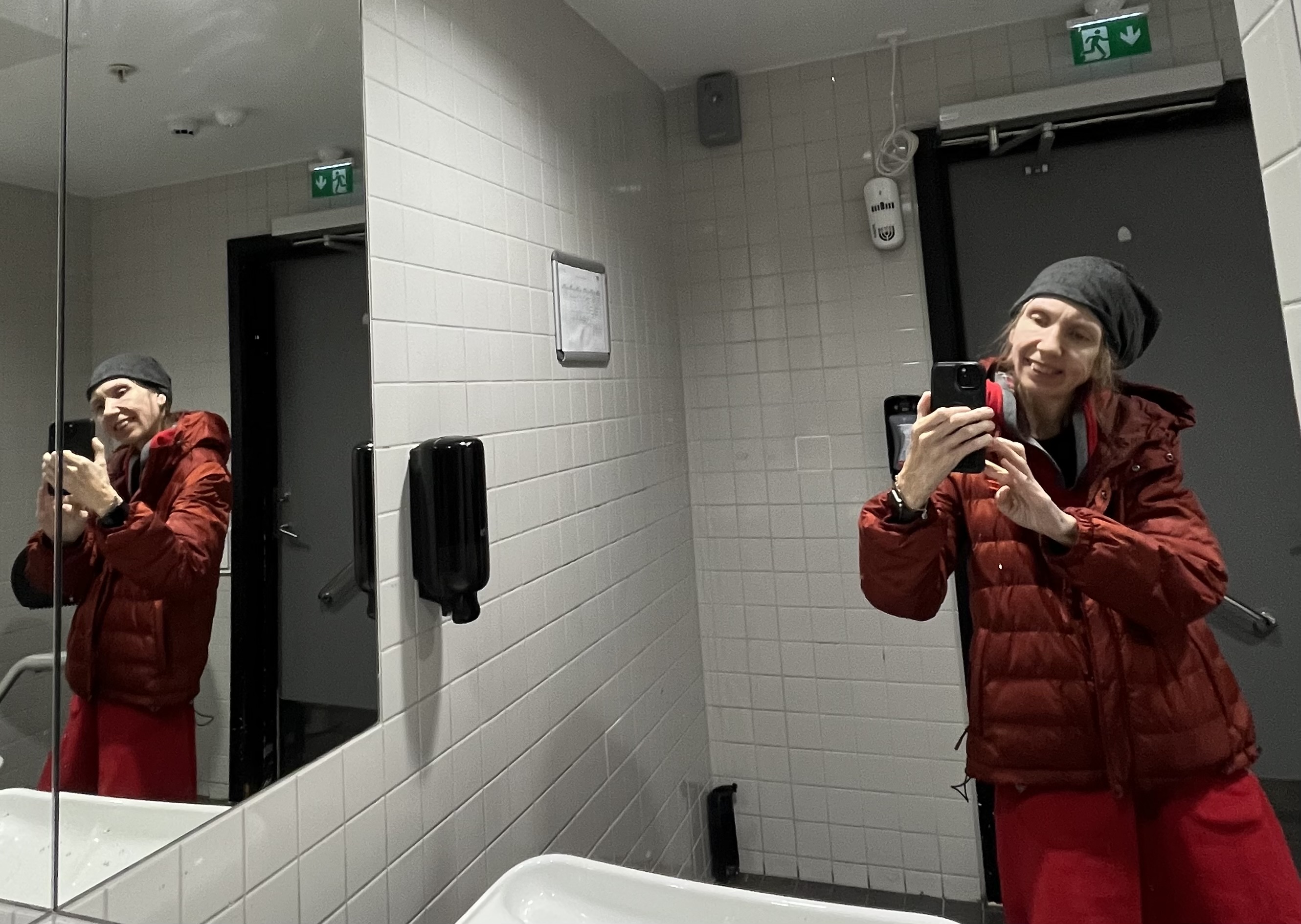 Det er underlig. Hvordan jeg egentlig kan hate kroppen, spesielt med effektene etter yrkesskaden, og samtidig noen ganger bli glad av å se meg i speilet – på lørdag var jeg på et handlesenter, måtte brått og uventet tisse og gikk på toalettet. Der var det store speil på to vegger som tilsammen laget to av meg. Og det kjentes helt ok, også var jo begge «meg-«ene i godt humør den dagen. Kommunikasjonen hadde gått fint, jeg kjente meg i vater og jeg opplevde hyggelige ting på tur: kjøp av tre kokebøker, en grønnsak til kokkelering og først og fremst eller til syvende og sist også: fine impulser, felles snakk-ingser, morsomme utstillinger i vinduene, latter og (gjensidig!!) trivsel og glede.