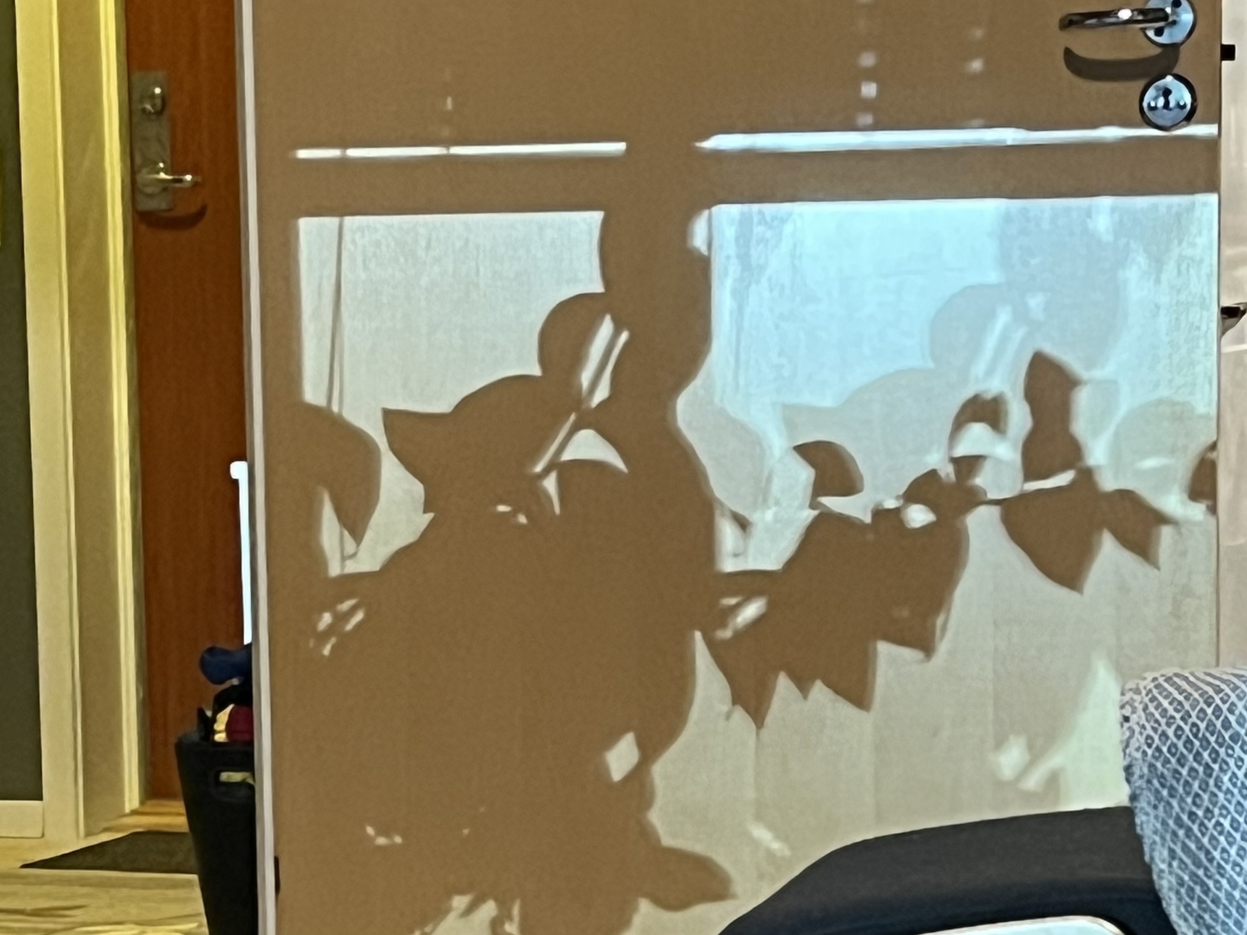 I det siste, har vi hatt mye godt vær. Av og til sitter jeg og fryder meg over naturens bilder, muligheten til å få se ting på andre måter. Som den enkle døra som gjør at man kan lukke mellom gang og stue, men som er koseligst å ha som åpent areal – den fikk et vakkert skyggespill fra sitrontreet mitt som står ved vinduet da sola skinte forbi og inn (se bildet under innlegget).