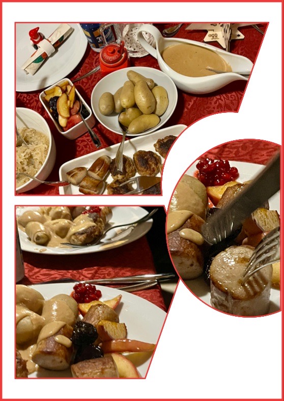 I helga som var, laget jeg selv julemiddag til gjestene mine. Det ble honningstekte epler og svisker, julepølser, sennepsglaserte medisterkaker, rørte tyttebær, surkål, mandelpoteter og brun saus av kraft og helmelk med et hint av dijonsennep. Det meste av dette er smaker som var da jeg var barn – riktig nok finspisset og oppgradert med for eksempel glasering – og minner jeg vil bevare og kjenner at gjør godt til alle som får. Takk for årene som går og likevel ikke: går over.