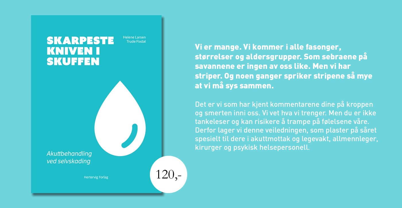 September 2017 kom boka Skarpeste kniven i skuffen, akuttbehandling ved selvskading, ut. Den er laget i samarbeid med psykiater og lege Trude Fixdal og Hertervig forlag. Det er en liten bok om hvordan man kan møte mennesker som skader seg selv. Du finner mer om den her.